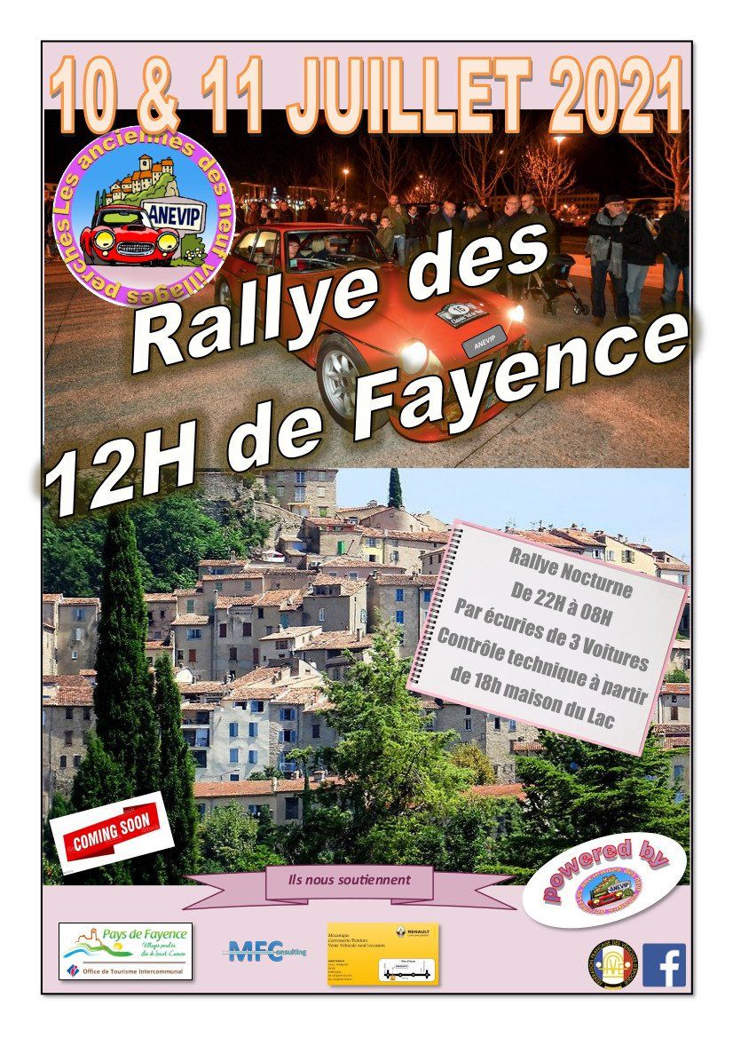 ANEVIP à l’écoute des passionnés, a décidé d’innover en imaginant ces 12 heures de Fayence, qui s’adresse bien sur à tous (véhicules d’avant 1985 !!!) mais en ciblant les nombreux clubs de la région Sud et de France, ou simplement des amis qui ont envie de "faire quelque chose" par équipe. C’est l’opportunité rêvée d’aligner aux couleurs de votre club, trois véhicules et de partager l’adrénaline d’une conduite de nuit en relais ou il ne s’agit pas d’aller vite mais de respecter une moyenne horaire sur l’ensemble des 3 relais et pour les trois voitures pour espérer être bien classé. Bien entendu les candidatures individuelles sont les bienvenues et ANEVIP constituera les équipes en complément des écuries déjà formées, les participants inscrits individuellement seront intégrés à des écuries incomplètes, dans lesquelles ils seront rassemblés pour former une écurie de 3 véhicules. Dans tous les cas dépêchez-vous de vous inscrire car pour assurer un déroulement de qualité de cette épreuve, seulement 8 écuries pourront s’inscrire.