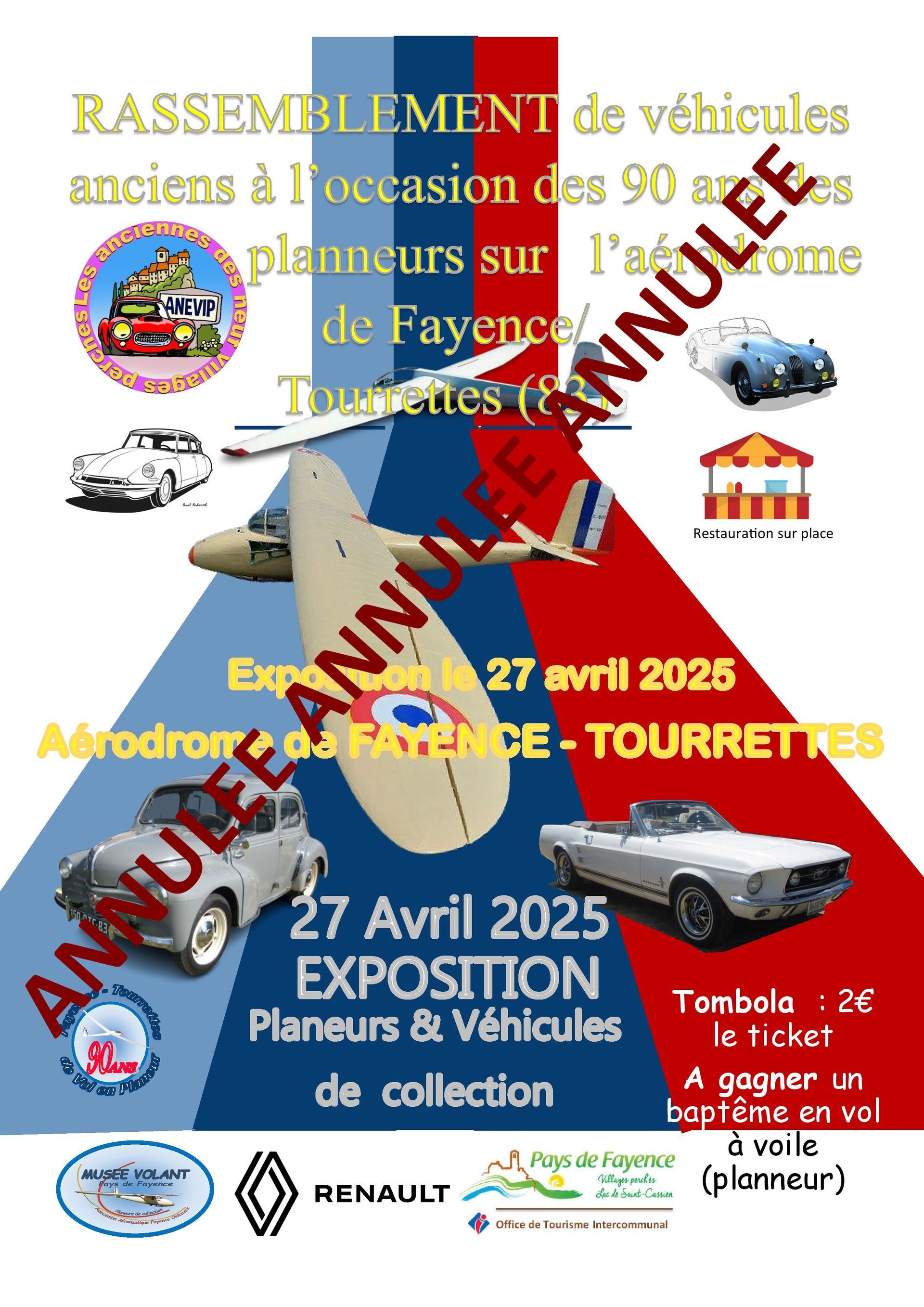 Vous avez été fort nombreux à marquer votre intérêt pour cette manifestation de rassemblement du 27 Avril à l’occasion de la journée publique de célébration des 90 ans du vol à voile sur l’aérodrome de Fayence. Anevip a le regret d’annoncer devoir renoncer à coorganiser cet événement, les conditions d’organisation de célébration de l’anniversaire de l’activité aéronautique phare de Fayence ne permettant plus l’insertion jumelée d’un rassemblement de voitures anciennes. Nous sommes sincèrement désolés de décevoir les attentes des nombreux passionnés, situation indépendante de notre volonté et bien entendu nous réfléchissons à vous proposer d’autres événements et à d’autres dates comme nous le faisons depuis 2020. Merci de votre compréhension.